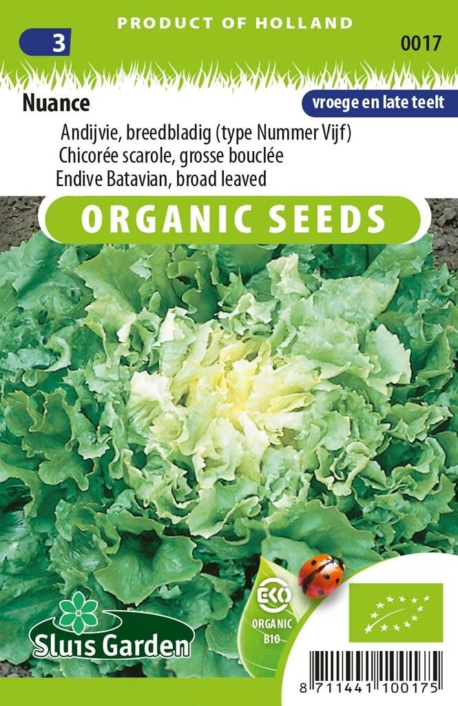 Biologische andijvie zaden breedblad nuance: smaakvolle oogst uit eigen tuin. Biologische andijvie zaden breedblad Nuance van Sluis Garden is een uitstekende keuze voor de biologische moestuin. Dit op zichzelf staande ras van het type "Nummer Vijf" vormt prachtige, dichtgevulde kroppen met een mooi geel hart. De planten zijn zeer goed bestand tegen schieten en het geel verkleuren van de bladranden, wat zorgt voor een betrouwbare oogst in verschillende seizoenen.