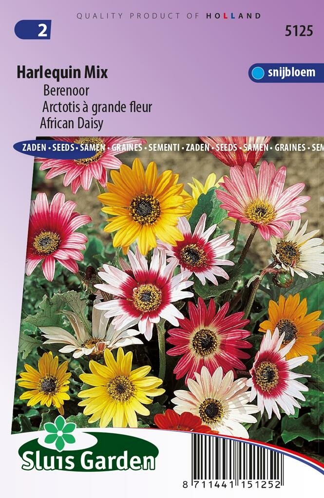 Deze eenjarige zomerbloeier bloeit van juli tot september en trekt met zijn vrolijke kleuren veel bekijks in je tuin. De Arctotis Acaulis Harlequin Mix is een echte blikvanger in je tuin dankzij: