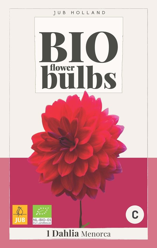 - De BIO Dahlia Menorca heeft een zeer mooie grote bloem, met een rode kleur. Deze dahlia word 50 cm worden.