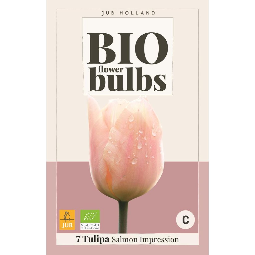 Bio Tulp Salmon Impression: Elegante Zalm-Roze Schoonheid. Ontdek de prachtige Bio Tulp Salmon Impression van het merk Jub, een indrukwekkende Darwin hybride tulp die je tuin transformeert met zijn elegante zalm-roze kleur. Deze biologisch geteelde tulp (SKAL NL-BIO-01 gecertificeerd) groeit uit tot een imposante verschijning van wel 60 cm hoog en produceert bloemen die in volle zon een diameter van 7 cm kunnen bereiken.