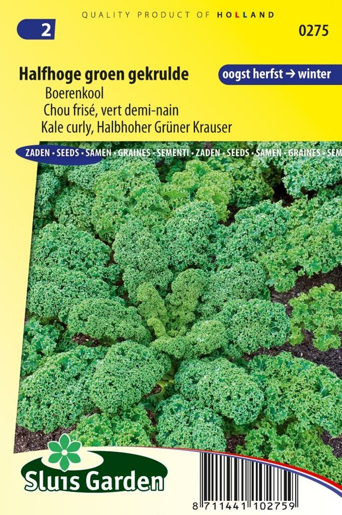 Boerenkool Halfhoge Groen Gekrulde: Winterharde klassieker voor je moestuin. De boerenkool halfhoge groen gekrulde van Sluis Garden is een veelzijdige en minder veeleisende koolsoort die op vrijwel elke grondsoort goed gedijt. Deze winterharde boerenkool heeft prachtig gekrulde bladeren en is rijk aan mineralen en vitamines B en C. Je kunt deze boerenkool het hele winterseizoen door oogsten, wat hem tot een ideale keuze maakt voor je moestuin. Perfect voor de klassieke boerenkoolstamppot met rookworst!
