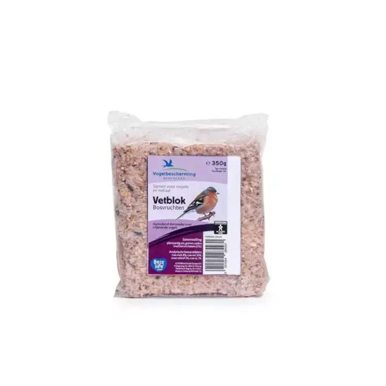 Bosvruchtenvetblok van Vogelbescherming is een hoogwaardige energiebron voor tuinvogels. Dit vetblok zit boordevol essentiële oliën en vetten, aangevuld met energierijke zaden, vruchten en bessen. Vooral in de koudere maanden hebben vogels behoefte aan extra energie om hun lichaamstemperatuur op peil te houden. Met dit smakelijke vetblok help je de tuinvogels de winter door en kun je genieten van hun vrolijke aanwezigheid in je tuin.