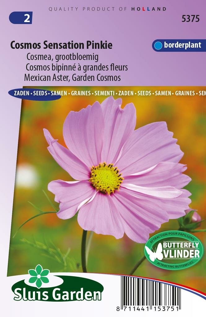 Cosmos bipinnatus zaden Sensation Pinkie: Stralende roze schoonheid voor je tuin. Cosmos bipinnatus zaden Sensation Pinkie is een opvallende eenjarige bloemsoort die je tuin transformeert met uitbundige roze bloemen. Deze prachtige plant uit het Sluis Garden assortiment staat bekend om zijn aantrekkingskracht op vlinders, bijen en andere nuttige insecten. Met een indrukwekkende hoogte van 110 cm vormt deze Cosmos een prachtige achtergrondbeplanting die van juni tot en met oktober bloeit.