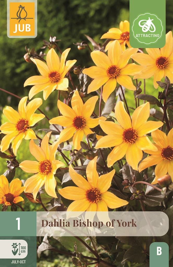 Dahlia Bishop of York: Stralende gele schoonheid voor je tuin. De Dahlia Bishop of York is een indrukwekkende border dahlia met een prachtige gele kleur die elke tuin opfleurt. Deze grote dahlia van het gerenommeerde merk Jub kenmerkt zich door zijn mooi gevormde, puntige bloemblaadjes die samen een perfecte ronde bloem vormen. Met een hoogte van ongeveer 100 cm is deze dahlia een echte blikvanger in borders en bloembedden, waar hij van juli tot en met oktober uitbundig bloeit.