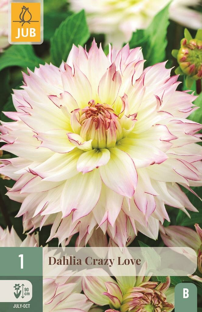 Dahlia Crazy Love: Een spectaculaire tuinblikvanger. Maak kennis met de Dahlia Crazy Love, een indrukwekkende decoratieve dahlia van het kwaliteitsmerk Jub. Deze bijzondere dahlia kenmerkt zich door zijn grote, volledig gevulde bloemen met een opvallende paars-witte kleur. De brede bloemblaadjes met hun karakteristieke golvende effect maken deze dahlia tot een echte blikvanger in je tuin. Als één van de oudste dahlia-soorten combineert de Crazy Love klassieke schoonheid met een spectaculaire uitstraling.