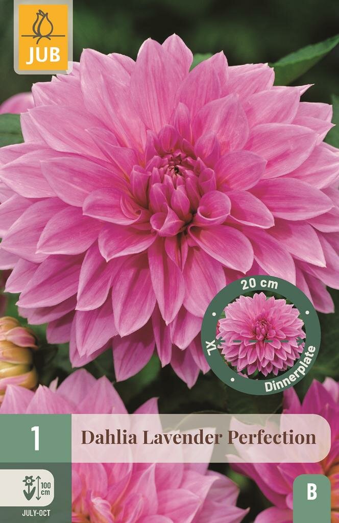 Dahlia Lavender perfection: een spectaculaire aanwinst voor je tuin. Maak kennis met de Dahlia Lavender perfection, een indrukwekkende dinnerplate dahlia van het kwaliteitsmerk Jub. Deze bijzondere dahlia onderscheidt zich door zijn enorme bloemen met een doorsnede van minimaal 20 centimeter. De brede bloemblaadjes hebben vaak een sierlijk golvend effect en de prachtige roze kleur zorgt voor een opvallende verschijning in elke tuin. Met een hoogte van ongeveer 100 centimeter is deze dahlia een echte blikvanger.