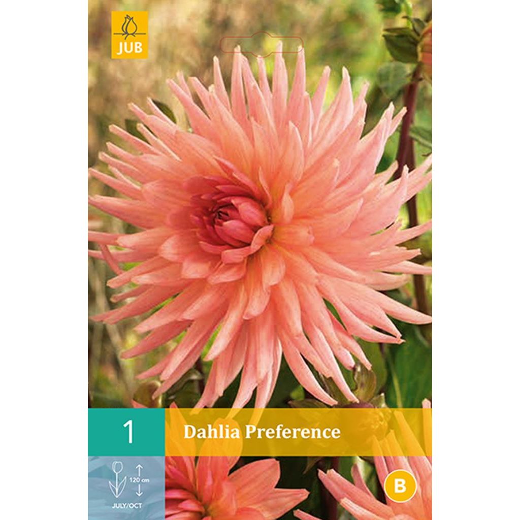 - De Dahlia Preference heeft een mooie grote bloem, met een zalm kleur. Deze dahlia kan maar liefst 120 cm worden.