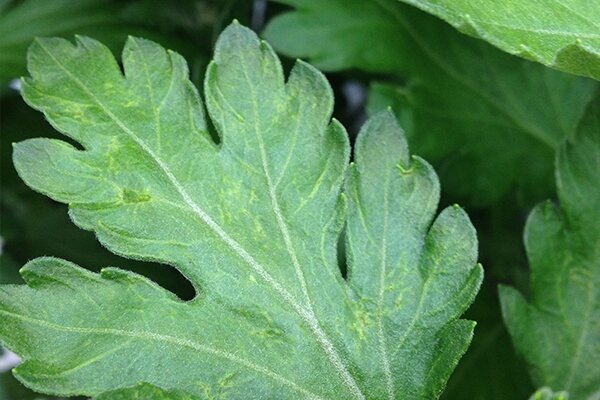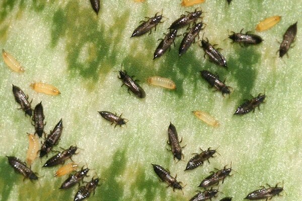 Trips zitten in groepjes op de bovenkant van het blad, waar je ze herkent aan hun langwerpige vorm en strepen. Hun larven zijn een beetje doorzichtig en leven juist aan de onderkant van het blad.
