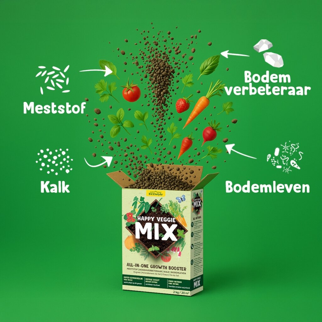 De Happy veggie mix is eenvoudig te gebruiken en zorgt voor een natuurlijke balans in je moestuin, wat resulteert in gezondere planten en een betere oogst. De Happy veggie mix is een complete voeding die je moestuinplanten alles geeft wat ze nodig hebben voor een rijke oogst.