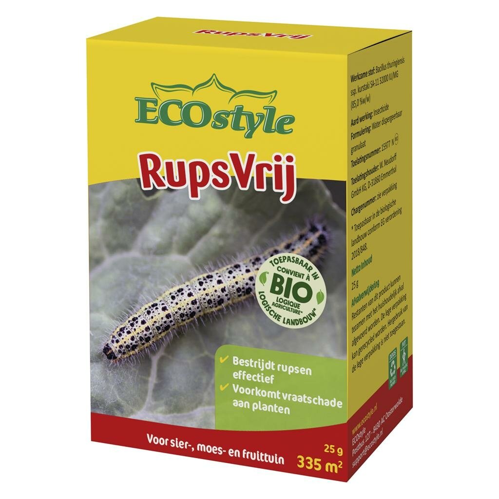 Bescherm uw waardevolle planten tegen vraatzuchtige rupsen met Ecostyle RupsVrij Delfin. Dit biologische product is de ideale oplossing voor tuinliefhebbers die op een natuurlijke wijze rupsen willen bestrijden zonder schadelijke chemicaliën te gebruiken. De handige verpakking met drie doseerzakjes maakt het product gemakkelijk in gebruik.