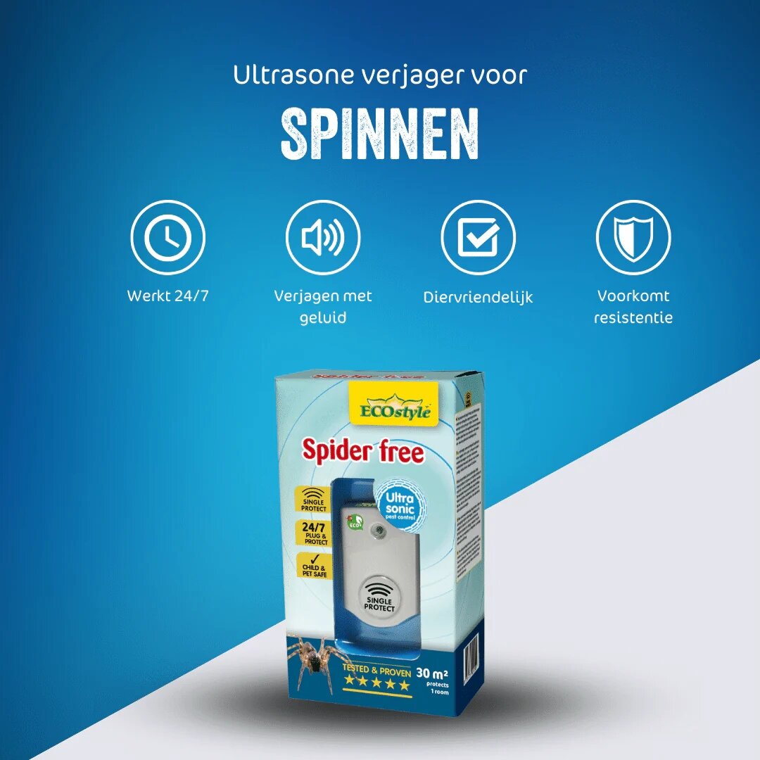 Deze ultrasone spinverjager is de ideale oplossing voor wie op een diervriendelijke manier spinnen uit huis wil weren. De Ecostyle spider free maakt gebruik van geavanceerde single protect geluidstechnologie die een voor spinnen ondraaglijke omgeving creëert. Het apparaat zendt ultrasone geluidsgolven uit met een variërende frequentie, waardoor spinnen de behandelde ruimte zullen vermijden zonder dat ze er resistent tegen kunnen worden.