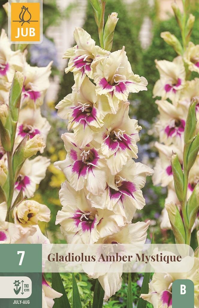 Gladiool Amber Mystique: Elegante zomerbloeier voor je tuin. De Gladiool Amber Mystique is een prachtige zomerbloeier die je tuin transformeert met zijn opvallende paars-amber kleurige bloemen. Deze elegante gladiool van het merk Jub wordt ongeveer 110 cm hoog en vormt een indrukwekkend element in borders en bloemperken. De sierlijke bloemen zijn niet alleen een lust voor het oog in de tuin, maar ook perfect voor zomerse boeketten.