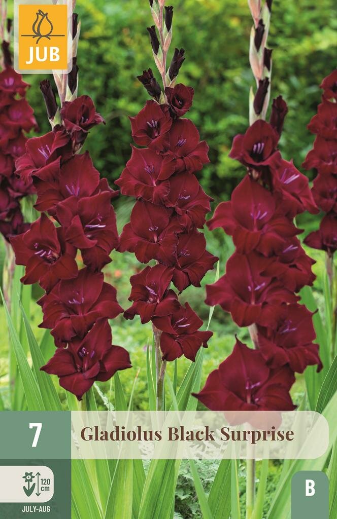 Gladiool Black Surprise: Elegante zomerbloeier voor je tuin. Breng je tuin tot leven met de prachtige Gladiool Black Surprise van het merk Jub. Deze indrukwekkende zomerbloeier kenmerkt zich door zijn dieprode kleur en statige verschijning. Gladiolen behoren tot de meest geliefde zomerbloemen, zowel voor in de tuin als in boeketten. Met een hoogte van ongeveer 120 cm vormt deze gladiool een opvallend element in borders en bloembedden.