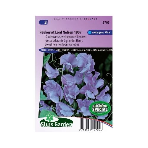 Lathyrus Odoratus zaden Lord Nelson 1907 reukerwt. Deze prachtige en heerlijk geurende siererwt bloeit met 2-3 heldere donkerblauwe bloemen per steel. De variëteit Lord Nelson 1907 ontving een "Award of Merit" in het jaar 1907 en werd vrijwel direct uitgebracht door de firma Burpee in Verenigde Staten onder de naam "Briliant Blue". Lathyrus Odoratus vraagt om een goed bewerkte en bemeste grond. De zaden voor het zaaien 6 uur laten weken.