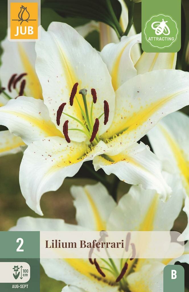 Ontdek de elegante Lelie Baferrari voor een stralende zomertuin. Maak kennis met de prachtige Lelie Baferrari, een elegante witte lelie uit het assortiment van Jub. Deze Aziatische lelie, ook wel bekend als de 'gewone lelie', is een ware blikvanger in elke tuin. Met zijn sierlijke, opgeslagen bloemen in zuiver wit en een indrukwekkende hoogte van 100 cm, zorgt deze lelie voor een spectaculaire verschijning in borders en plantenbakken tijdens de late zomermaanden.