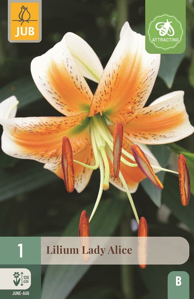 Lelie Lady Alice: Elegante Aziatische lelie voor je tuin. De Lelie Lady Alice is een prachtige Aziatische lelie van het merk Jub die je tuin verrijkt met haar opvallende oranje bloemen met witte accenten. Deze elegante lelie behoort tot de oudere soorten binnen de lelies en kenmerkt zich door de sierlijk omgeslagen bloemblaadjes. Met een indrukwekkende hoogte van 120 cm vormt deze lelie een ware blikvanger in borders, plantenbakken of als snijbloem in een boeket.