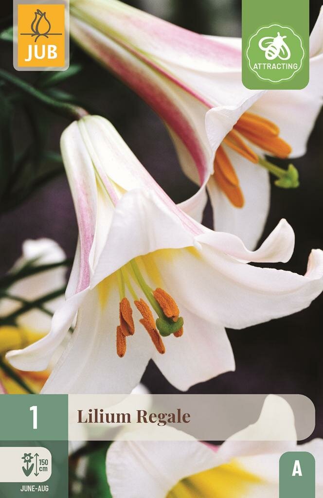 Koninklijke Lelie Regale: Elegante schoonheid voor je tuin. De Lelie regale is een majestueuze tuinplant die bekend staat om zijn indrukwekkende witte bloemen en betoverende geur. Deze koninklijke lelie van het gerenommeerde merk Jub groeit uit tot een imposante hoogte van 150 cm, waardoor hij een ware blikvanger wordt in elke tuin. De grote, trompetvormige bloemen verspreiden vooral in de avonduren een heerlijke zoete geur die je hele tuin parfumeert.