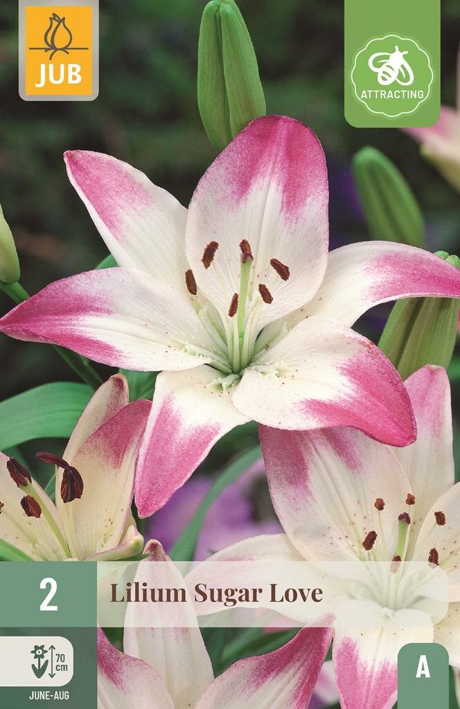 Lelie Sugar Love: Een elegante toevoeging aan je tuin. Ontdek de prachtige Lelie Sugar Love, een betoverende Aziatische lelie van het gerenommeerde merk Jub. Deze opvallende lelie kenmerkt zich door haar schitterende roze en witte bloemen die je tuin of terras een elegante uitstraling geven. Met een hoogte van 70 cm is deze lelie perfect voor zowel borders als potten, waar ze van juni tot augustus een kleurrijke show geeft.