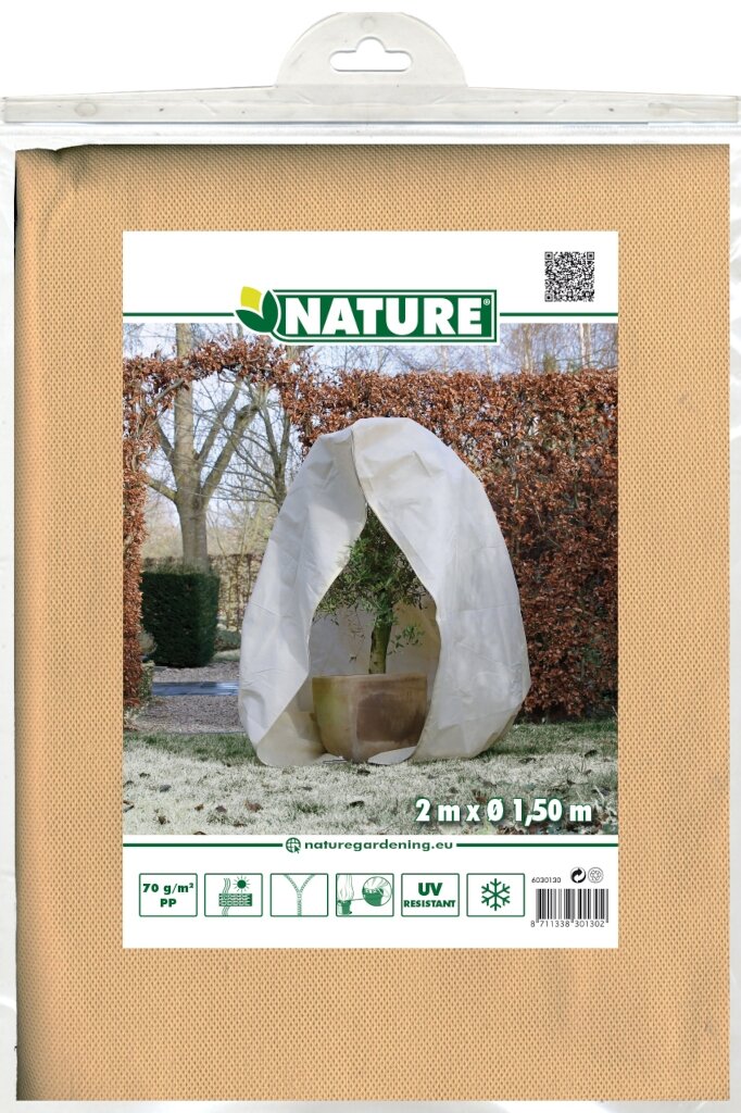 Bescherm je waardevolle planten en bomen effectief tegen vorst met de Winterafdekhoes met rits H 200 cm D 150 cm beige van Nature. Deze speciaal ontworpen hoes is gemaakt van hoogwaardig, beige niet-geweven polypropyleen materiaal dat UV-bestendig is en een dichtheid heeft van 70 g/m². De praktische ritssluiting en het aantrekkoord maken het aanbrengen en verwijderen bijzonder eenvoudig.
