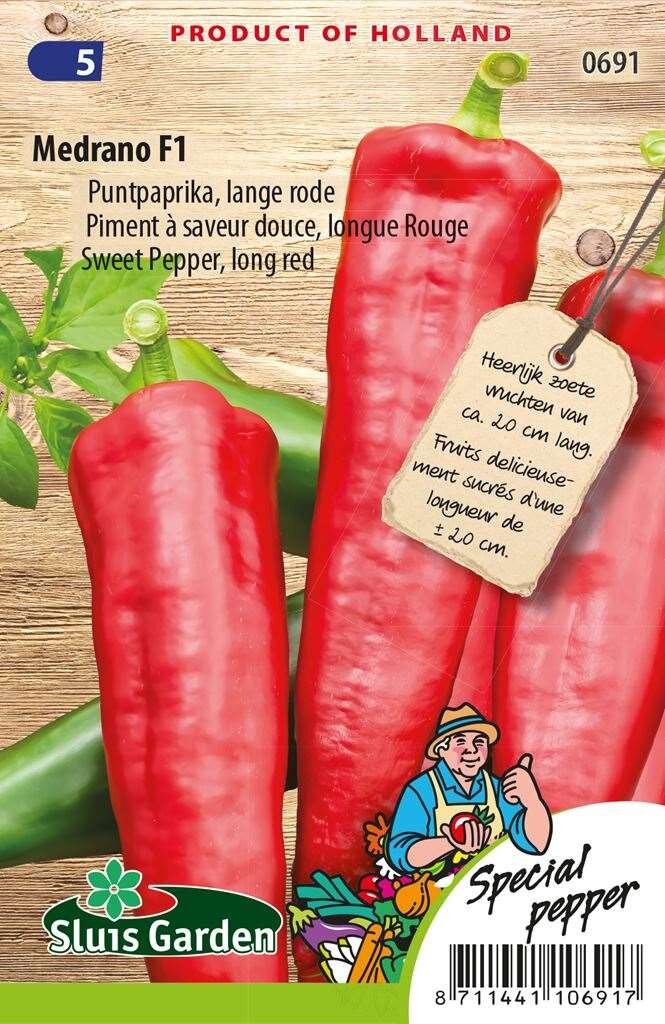 Paprika Medrano F1: Zoete puntpaprika voor tuin en kas. Paprika zaden lange rode Medrano F1 van Sluis Garden zijn perfect voor liefhebbers van zoete puntpaprika's. Deze 17-20 cm lange en 5 cm brede paprika's hebben een heerlijk zoete smaak met een brix-waarde van 8/9. De compacte planten zijn sterke groeiers die van helgroen naar helder rood kleuren. Rijk aan vitaminen en mineralen, zijn deze paprika's een waardevolle aanvulling voor je moestuin of kas.