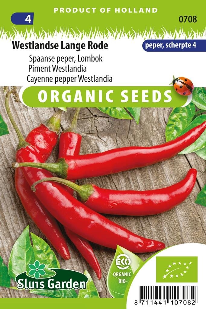 Peper Westlandse lange rode BIO: Biologische pittigheid voor je moestuin. Ontdek de Peper Westlandse lange rode BIO van Sluis Garden, een heerlijk pittige peper met een scherpte van 4 op de Scoville-schaal. Deze biologisch geteelde peper is perfect voor de thuiskweker die houdt van wat pit in de keuken. Met een opbrengst van ongeveer 25 vruchten per plant en een planthoogte van circa 75 cm, is deze peper een waardevolle aanwinst voor je moestuin of kas.