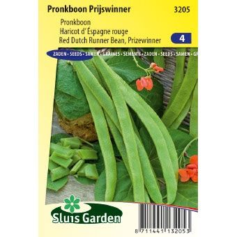 Pronkboon zaden Prijswinner is een zeer decoratief roodbloeiend ras met ca. 27 cm lange, vrij smalle, vlezige, groene bonen met paarsrode, zwart gesteepte zaden. Zeer jong plukken anders vormt zich een vlies en een draad. Gebruik als bij snijboon. Goed bestand tegen kou. Voor een vroege oogst onder glas zaaien of alvast in potjes voorzaaien. Bonen houden van warmte en teveel wind en nachtvorst zijn zeer schadelijk. Zaaien of uitplanten ná half mei in de vollegrond. Stokken dakvormig plaatsen en bij elke stok ca. 5 zaden planten en de planten later omhoog begeleiden.