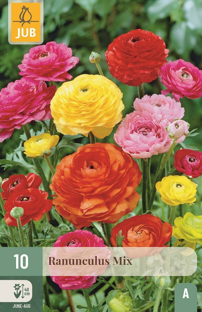 Ranonkel Mix: Kleurrijke Boterbloemen voor Jouw Tuin. De Ranonkel Mix van het merk Jub is een prachtige verzameling knollen die in de volksmond ook wel boterbloemen worden genoemd. Deze kleurrijke bloemen met hun dichte, rozetvormige bloemen zorgen voor een opvallend accent in elke tuin. Met hun levendige kleuren en elegante vorm zijn ze perfect voor borders en potten. De mix bevat 10 knollen in verschillende kleuren die uitgroeien tot ongeveer 40 cm hoge planten met een rijke bloei van juni tot augustus.