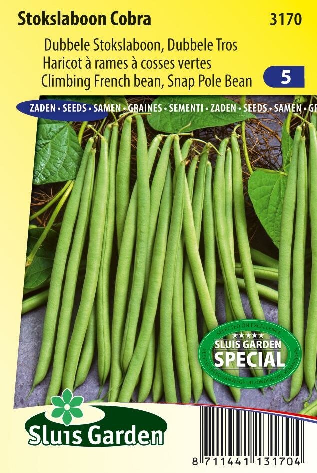 Stokslaboon Cobra: De perfecte keuze voor jouw moestuin. Stokslaboon Cobra is een verbeterde versie van de klassieke Westlandse stokslaboon, ontwikkeld door Sluis Garden. Deze hoogwaardige sperzieboon kenmerkt zich door zijn indrukwekkende 20 cm lange, donkergroene en vlezige peulen die in trossen van 4-5 stuks aan de plant hangen. De vroege, krachtige planten leveren een overvloedige oogst met een opvallend rijke smaak. Bovendien is deze variëteit zeer resistent tegen ziekten en heeft zwarte zaden.