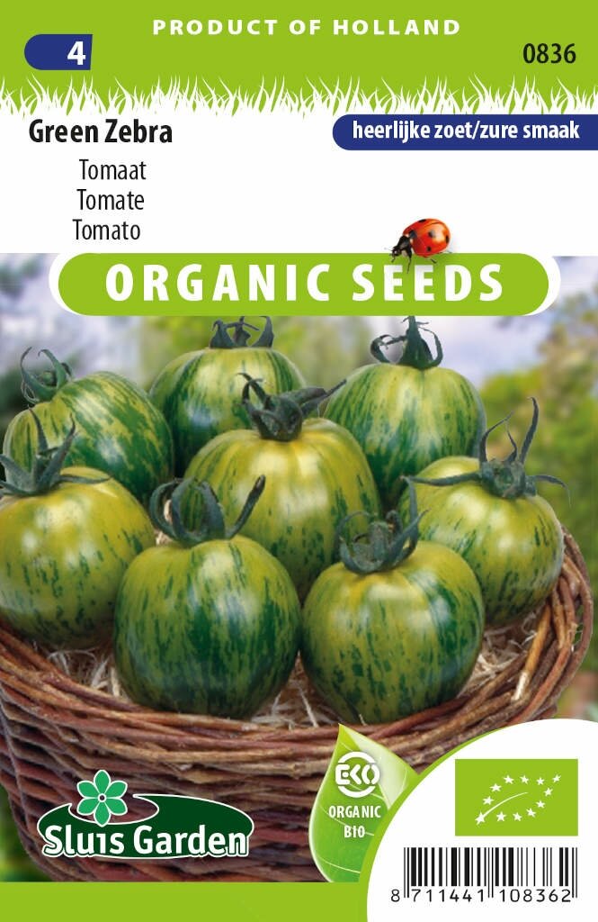 Ontdek de unieke green zebra improved BIO tomaat. Tomaat zaden Green Zebra improved BIO is een bijzondere biologische tomatensoort van het merk Sluis Garden. Deze prachtige tomaat produceert opvallende barnsteengroene vruchten met donkere citroenkleurige strepen, wat hem tot een waar sieraad in je moestuin maakt. Het vruchtvlees is heerlijk fris en krokant met een perfecte balans tussen zoet en zuur.