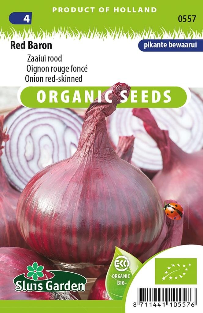 Ui Red Baron BIO: De perfecte rode ui voor je moestuin. Ui Red Baron BIO is een hoogwaardige biologische rode ui van het merk Sluis Garden. Deze platronde ui onderscheidt zich door zijn prachtige dieprode kleur en heerlijk zoete smaak. De Red Baron is speciaal gekweekt voor lange bewaring, waardoor je het hele jaar door kunt genieten van deze smaakvolle ui in je gerechten. De biologische teeltwijze zorgt voor een puur product zonder chemische bestrijdingsmiddelen.