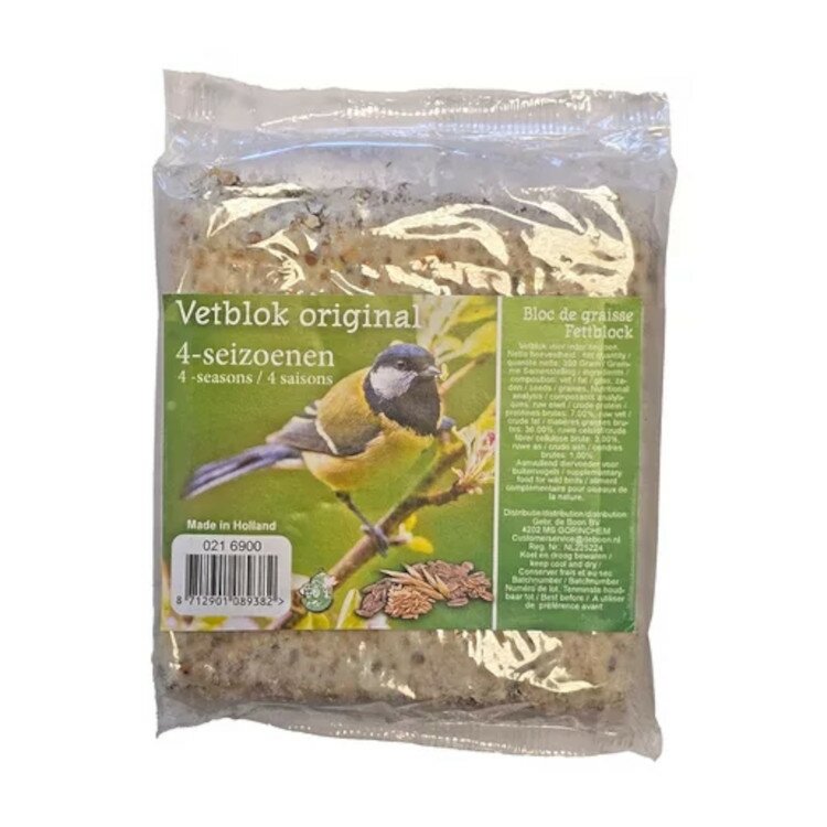 Verwen de vogels in je tuin met het Vetblok original 300g van Gebr. de Boon. Dit voedzame vetblok is speciaal samengesteld om tuinvogels te voorzien van essentiële vetten en energie, wat vooral in de koudere maanden van levensbelang is. Het compacte formaat maakt het gemakkelijk om op te hangen of te plaatsen in je tuin, balkon of terras.