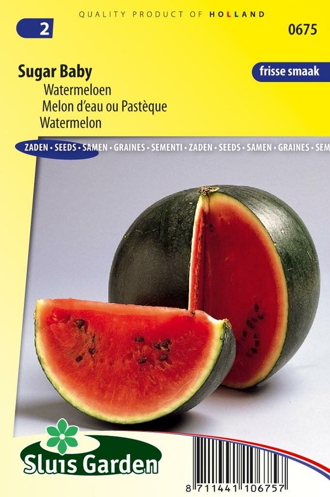 Watermeloen Sugar Baby: Zoete verfrissing voor je tuin. Watermeloen zaden Sugar Baby is een heerlijke watermeloensoort die ook in de Benelux uitstekend te telen is. Deze compacte watermeloen van het merk Sluis Garden produceert vruchten van ongeveer 4 kg met sappig, zoet rood vruchtvlees. De Sugar Baby doet zijn naam eer aan met een verrassend zoete smaak en is perfect voor zowel kas- als buitenteelt tijdens warme zomers. Met ongeveer 35 zaden per verpakking kun je meerdere planten opkweken voor een rijke oogst van deze verfrissende zomerlekkernij.