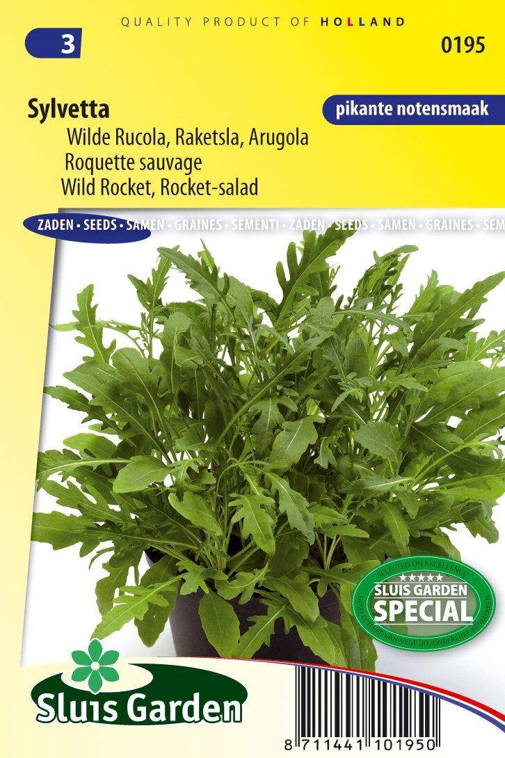 Wilde Rucola Sylvetta: Verfijnde smaakmaker voor je keuken. Wilde Rucola Sylvetta is een bijzondere variant van de reguliere rucola met een fijner blad en een krachtigere smaak. Dit snelgroeiende gewas van het merk Sluis Garden schiet niet snel in bloei, waardoor je langer kunt genieten van de heerlijke, pikante notensmaak. Perfect voor wie op zoek is naar een smaakvolle toevoeging aan diverse gerechten en eenvoudig te kweken, zelfs in de winter binnenshuis.