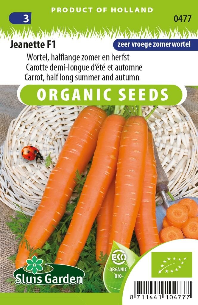Biologische Wortelzaden Jeanette F1: Vroege zomerwortel met zoete smaak. Wortel zaden Jeanette F1 BIO is een biologisch gecertificeerde zomerwortel van het merk Sluis Garden. Deze zeer vroege wortelsoort kenmerkt zich door een prachtige glanzende oranje kleur en een heerlijk zoete smaak. De gladde wortels worden ongeveer 22 cm lang en zijn niet alleen lekker vers, maar ook uitstekend bewaarbaar. Perfect voor de biologische moestuin!